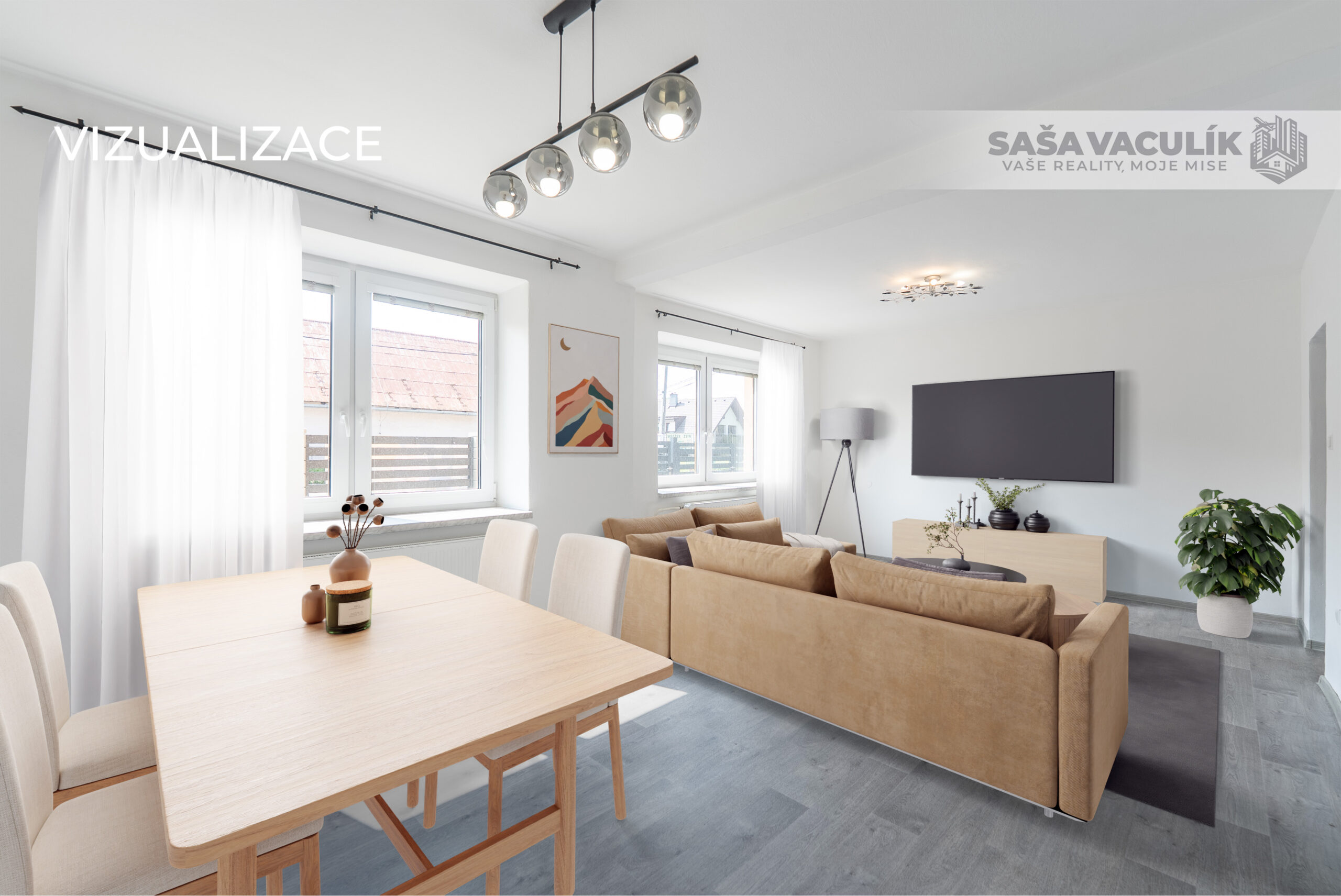 Dům je dispozičně řešen jako 3+1 s denní částí v přízemí a klidovou zónou v patře. Obývací pokoj orientovaný na východ je příjemně prosvětlený a navazuje na kuchyni s oknem na sever, což vytváří přirozeně propojený a funkční prostor pro každodenní život. V přízemí o ploše 65 m² se dále nachází koupelna a vstupní chodba. V patře o výměře 58 m² jsou k dispozici dva pokoje, šatna, koupelna s WC a balkon o velikosti 7 m².